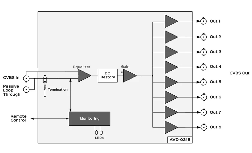 ماژول تقویتکننده توزیع ویدئوی آنالوگ صمیم، با امکان جبران اثر طول کابل و هشت خروجی میباشد که ورودی یک طرفه با امکان عبور از Loop-Passive ورودی نیز ارائه میدهد. این محصول مطابق با استاندارد ITU-R BT.470-6 طراحی شده و قابلیت نصب در فریمهای 3RU و 1RU صمیم را دارد. از جمله قابلیتهای کلیدی این ماژول میتوان به: Gain Control، حذف مولفه DC و بلوک اکولایزر برای جبرانسازی تلفات طول کابل اشاره کرد که عملکرد دقیق و حرفهای را در سیستمهای توزیع ویدیو فراهم میکنند.